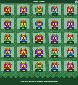 Log in every day from the 1st to the 25th of December to unwrap your festive items.